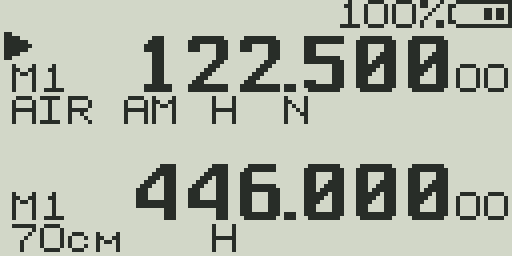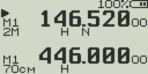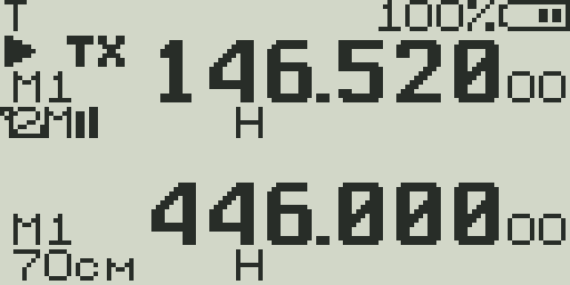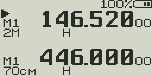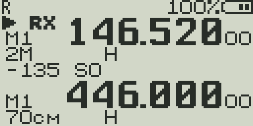 | Frequency | In VFO mode: frequency in MHz (e.g., 146.520). In channel mode: channel number (000–199) or channel name. |