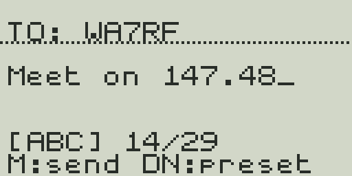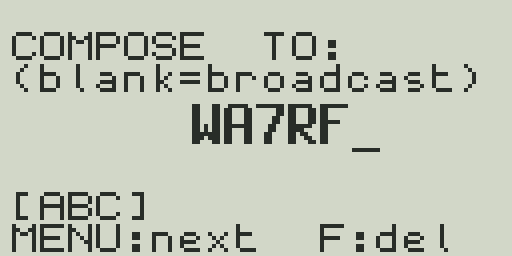 The cursor starts in the TO field. Enter the recipient's callsign using T9 text input (see below). To send a broadcast heard by all nearby stations, leave it blank or enter CQ. Press MENU to advance to the message body. Use F to backspace.