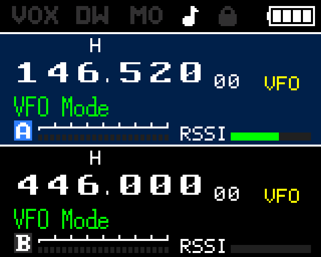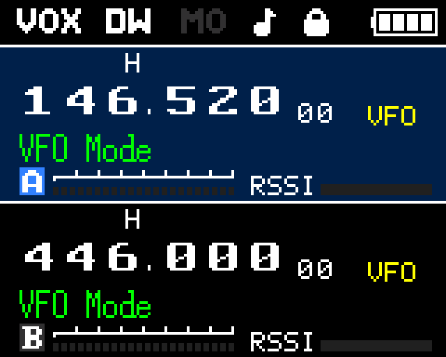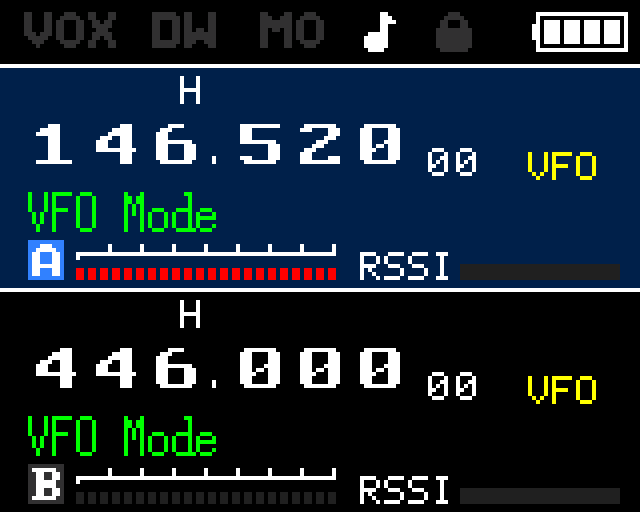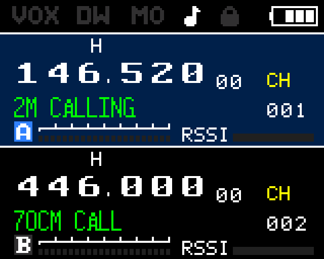 | Channel A | y: 17–71 | Frequency in large font, indicators row (power, narrow/wide, shift dir, reverse, AM, CTCSS/DCS, scramble), TX power bar (8 segments), RSSI bar, channel number |